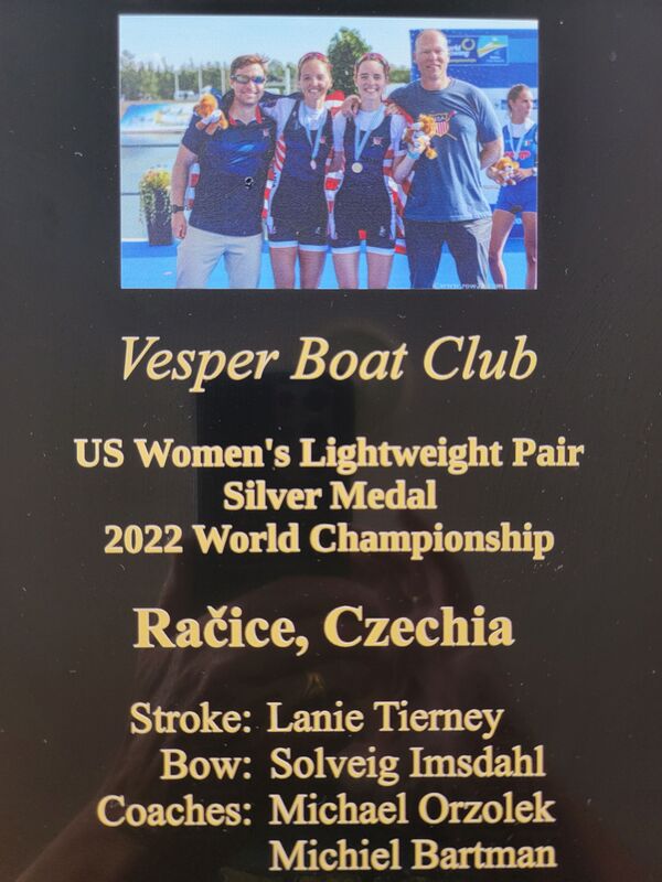 Vesper Boat Club US Women's LIghtweight Pair Silver Medal 2022 World Championship, Racice,Czechia plaque